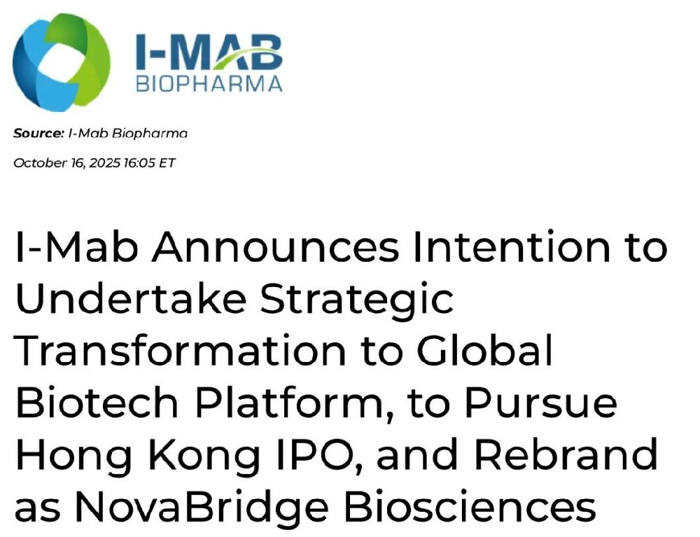 公告显示,此次战略转型,I-Mab计划通过在纳斯达克和香港证券交易所双重上市的方式进行香港IPO,扩大获得全球资本和创新的机会。公司计划以新名称NovaBridge Biosciences运营,名称变更将在股东批准后生效,预计将在2025年10月24日的特别股东大会(EGM)上生效。