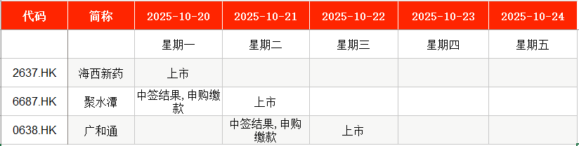 港股方面,Wind数据显示,本周(10月20日至10月24日)聚水潭(06687.HK)将在本周一申购缴款;广和通(28.490, 0.24, 0.85%)(00638.HK)将在本周二申购缴款。