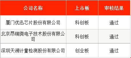 其中,上交所审核通过了厦门优迅芯片股份有限公司、北京昂瑞微电子技术股份有限公司的科创板IPO;深交所审核通过了深圳天溯计量检测股份有限公司的创业板IPO。