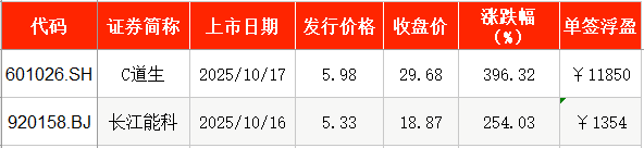 10月17日,道生天合在上交所正式挂牌上市,发行价为5.98元/股,截至上市首日收盘,该股报29.68元/股,涨幅为396.32%。以收盘价计算,投资者中一签浮盈为1.19万元。