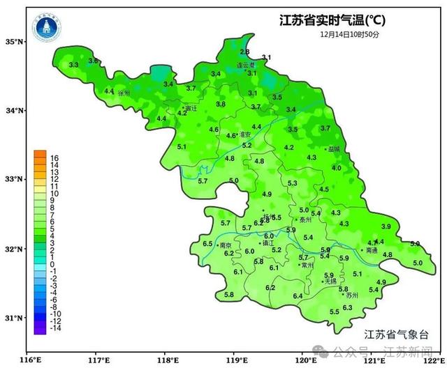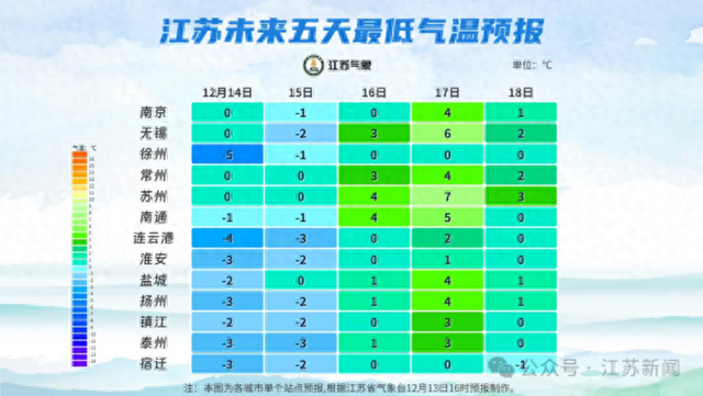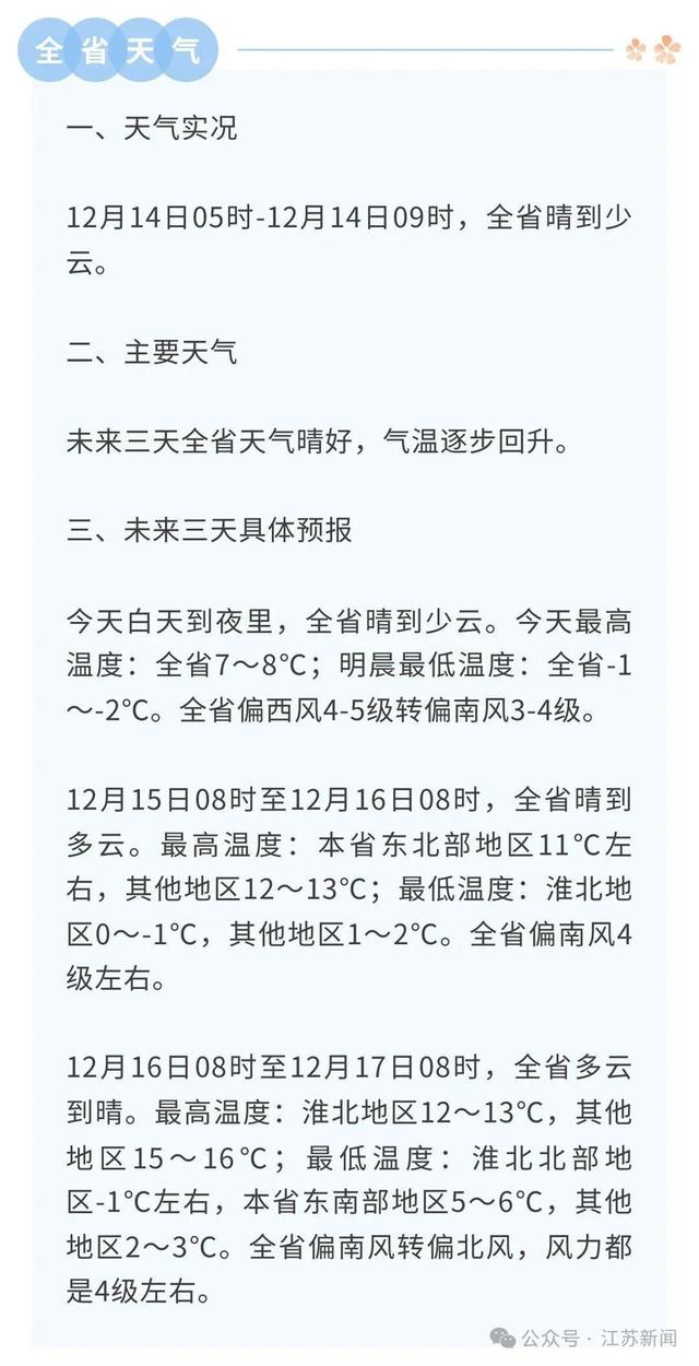 今天白天到夜里,江苏全省晴到少云。今天最高温度:全省7~8℃;明晨最低温度:全省-1~-2℃。全省偏西风4-5级转偏南风3-4级。